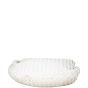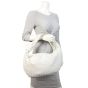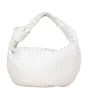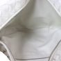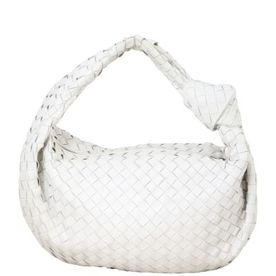 Features: Chalk white intrecciato leather exterior; single top handle with a knotted base on one side; silver tone hardware; top zip opening to main compartment; leather lined interior with 1 x zipped pocket.