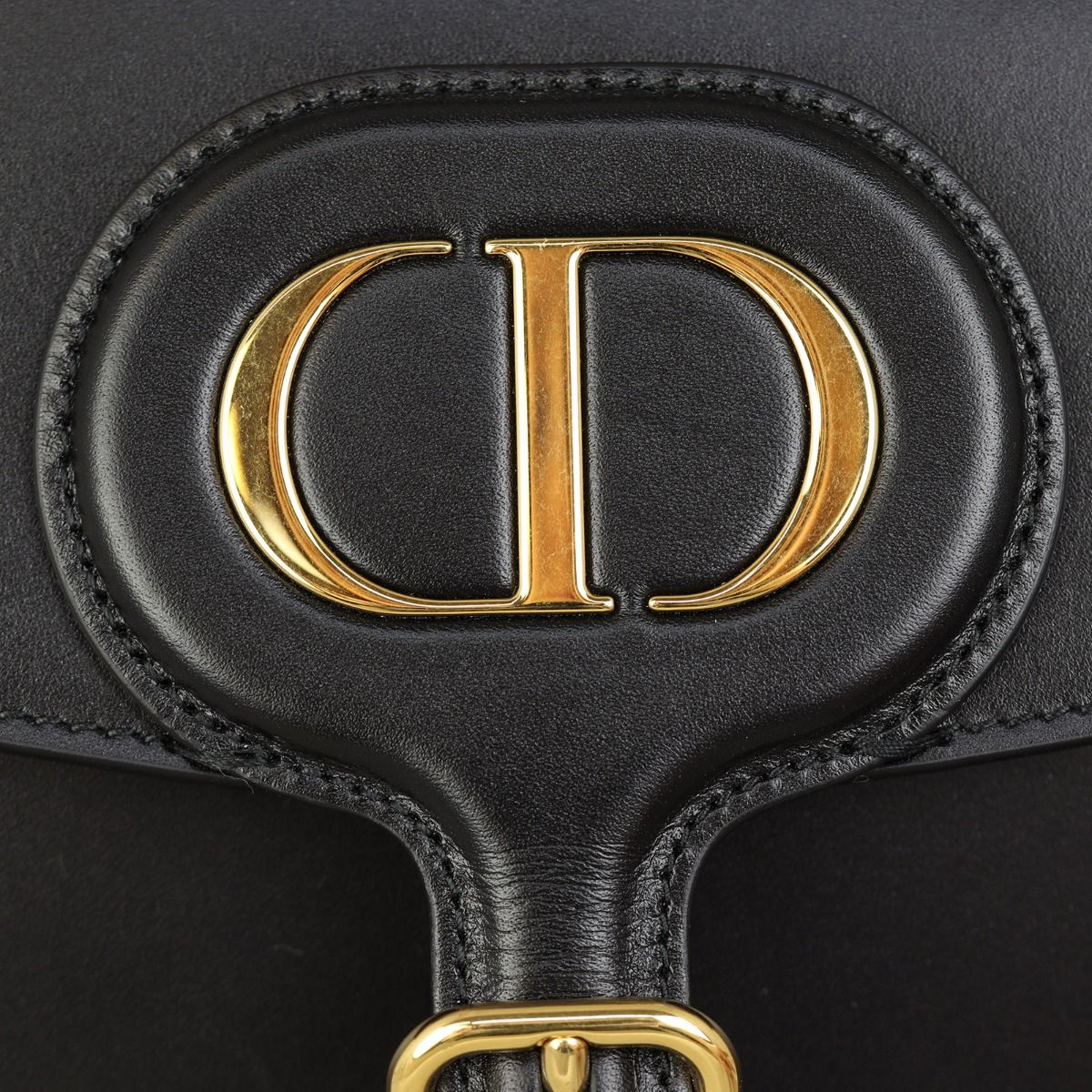 Features: Black box calfskin leather exterior; 30 Montaigne embossing at the rear; detachable oblique canvas logo shoulder strap with navy leather trim; gold tone hardware; 1 x exterior slip pocket; front flap with buckle detail and concealed magnetic snap closure; black microfibre lined interior with 1 x leather slip pocket.