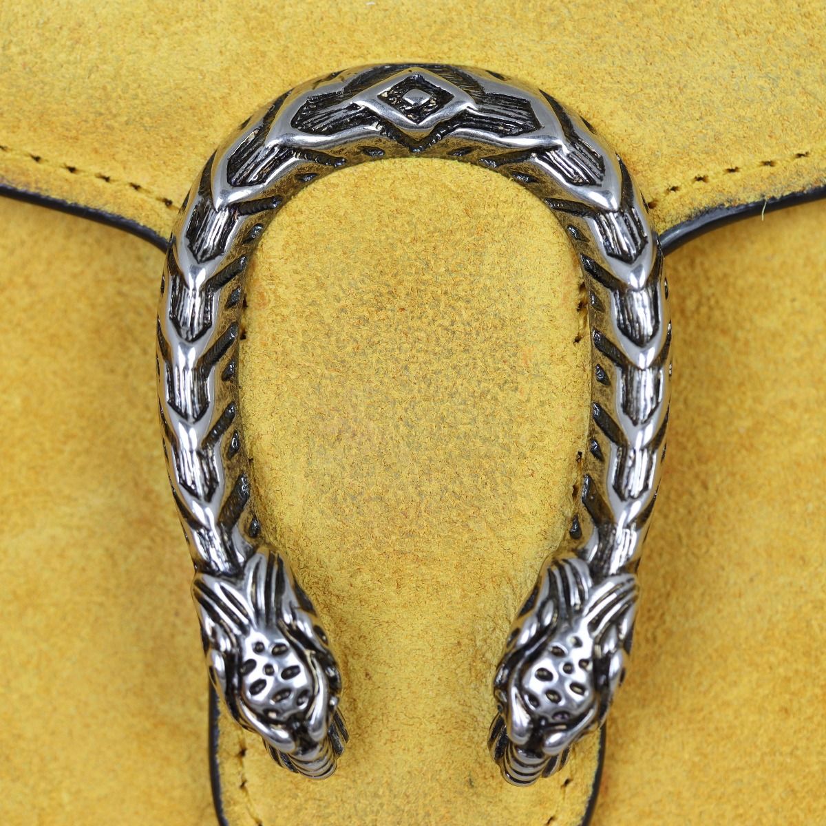 Features: Mustard yellow suede exterior; antiqued silver tone hardware including feature tiger head spur; detachable chain shoulder strap; flap with snap dome closure to leather and textile lined interior main compartment divided into three sections; 1 x zipped compartment; 2 x slip pockets; and 16 x card slots.
