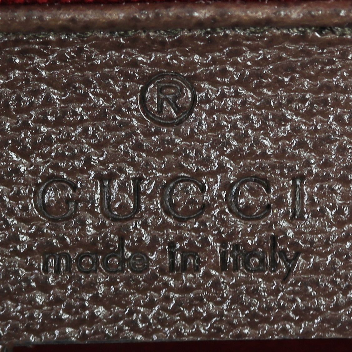 Features: Beige/ebony GG supreme coated canvas rigid exterior; cocoa brown grained leather trim; silver tone hardware; single bamboo top handle; detachable and adjustable leather shoulder strap; 2 x keys on leather strap; lockable S-lock to top lid; burgundy textile lined interior.