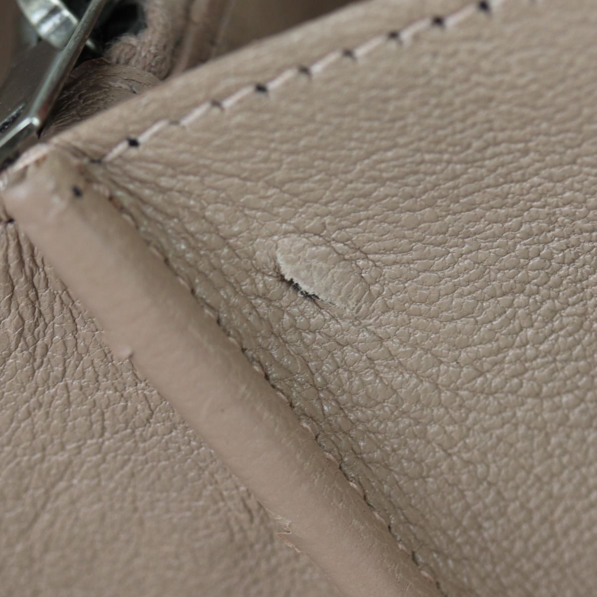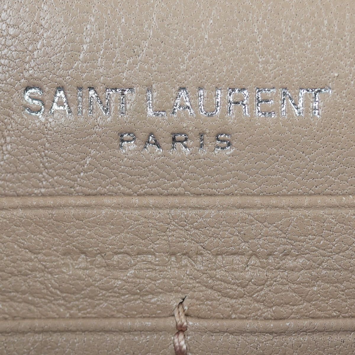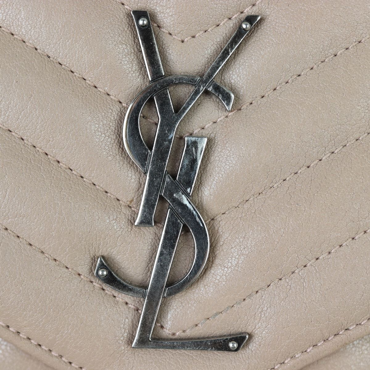 Features: Dark beige grain de poudre mix matelasse calfskin leather exterior; antiqued silver tone hardware including YSL monogram; detachable chain shoulder strap; top flap with dome closure to main compartment; black leather and textile lined interior with 2 x gusseted main compartments divided by a central zipped pocket; 2 x slip pockets and 20 x card slots.