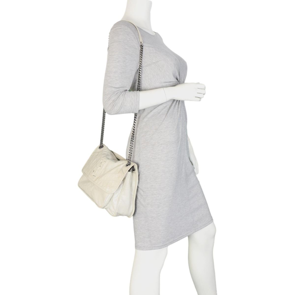 Features: Blanc Vintage (light beige) matelassé leather exterior; antiqued silver tone hardware; leather covered YSL monogram; sliding chain shoulder strap with two leather shoulder pads; exterior rear slip pocket with magnetic closure; top flap with magnetic dome closure to main compartment; front slip pocket under top flap; black textile lined interior with 1 x zipped pocket and 1 x flat pocket.